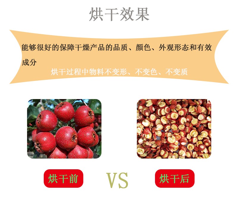 The mesh belt hawthorn dryer solves the requirements of weather and large site area for drying; At the same time, it solves many drawbacks such as labor costs and unstable quality in drying, greatly reducing the drying cost of hawthorn, realizing the streamlined production of dried hawthorn slices, and effectively improving the processing quality of hawthorn.
